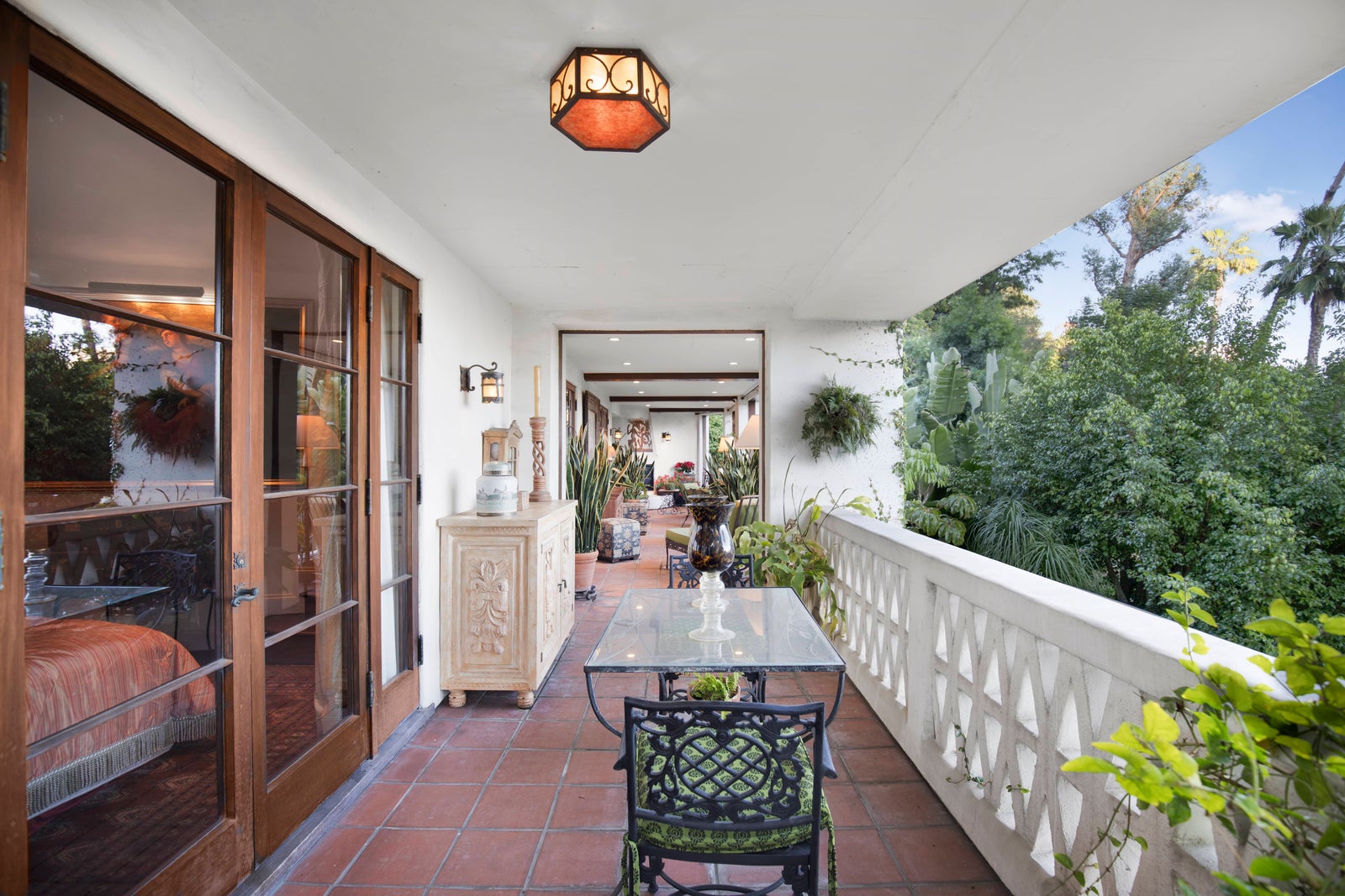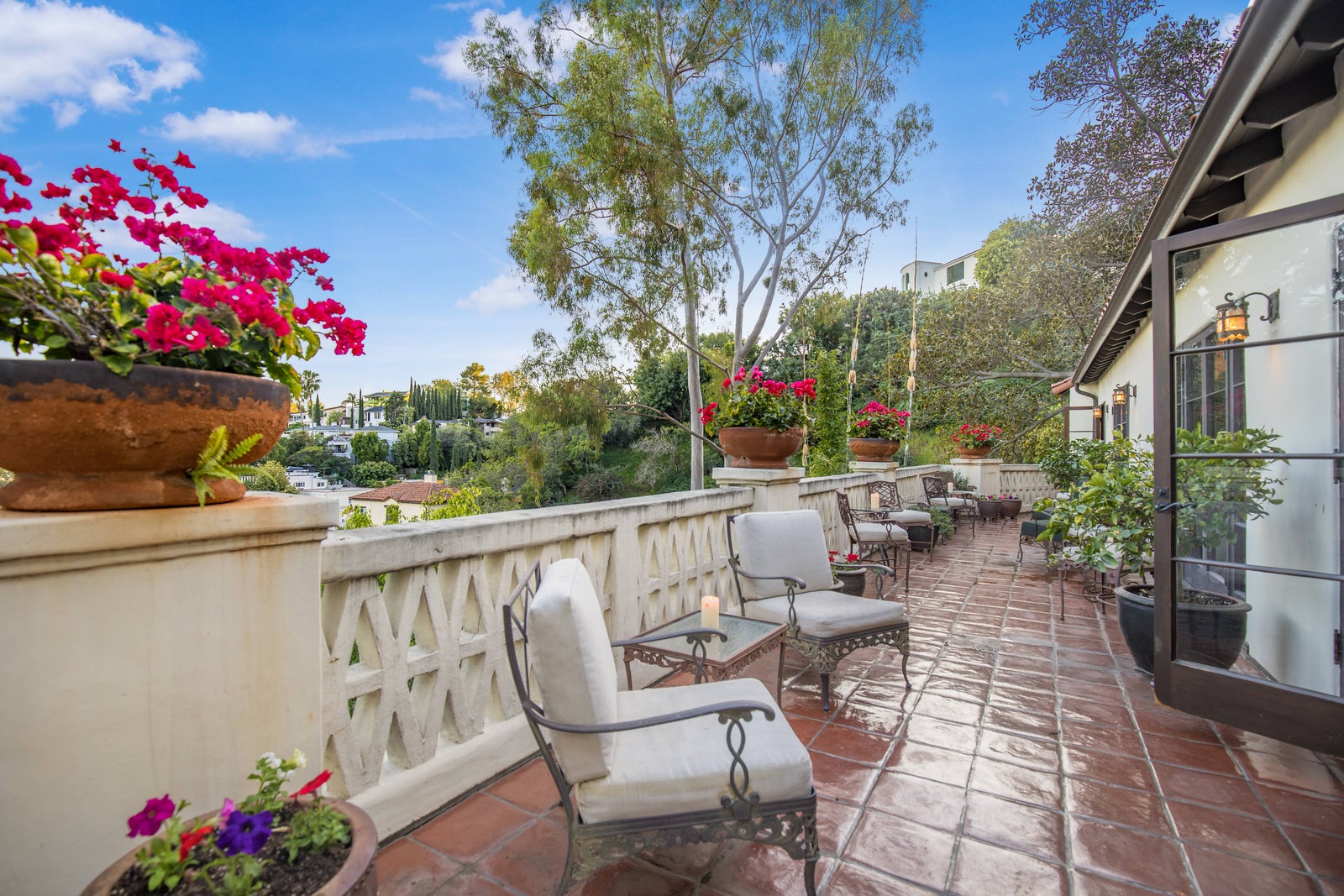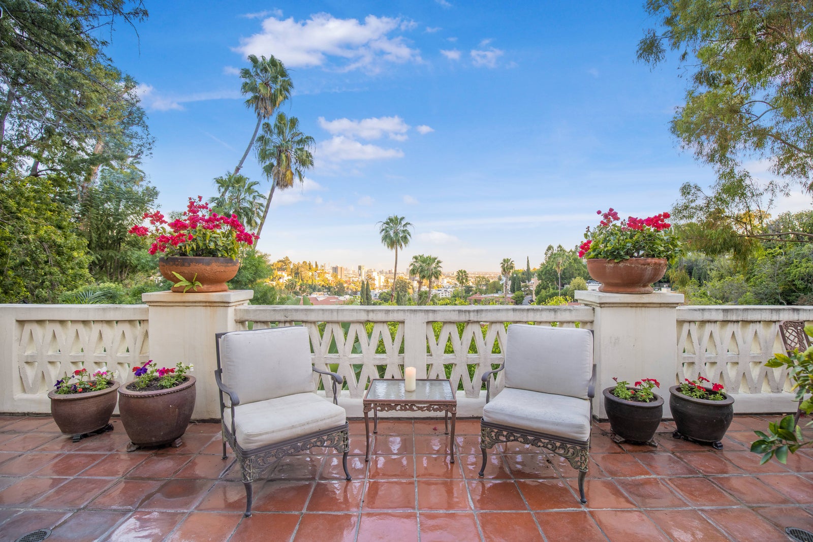 Two expansive terraces capture sweeping views across Hollywood and toward the greater Los Angeles skyline, extending to Long Beach in the distance. The property's multilevel gardens feature mature trees of every type, pathways, fountains, multiple patios and year-round blooming landscape.